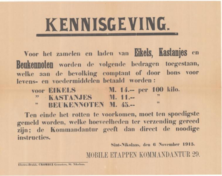 Voorlopig zit ik dus nog tussen de papieren. Ik heb net een kopie van een brief aan de Duitse gouverneur onder ogen gekregen, over de situatie in Melsele. Daar zijn 180 werklozen, en 130 noodlijdende gezinnen. De maandelijkse uitgaven aan werklozen en noodlijdenden bedraagt momenteel 500 frank, evenveel als wat de gemeente in juni heeft uitbetaald aan werklozen voor de werken die ze uitgevoerd hebben. In oktober was dat laatste bedrag al gestegen tot 2500 frank. We kunnen nochtans wat bijverdienen (contant of in bonnen). Blijkbaar zamelen de pinhelmen eikels, kastanjes en beukennoten in; voor die laatste krijg je zelfs 45 Mark per 100 kilo! Om het rotten tegen te gaan, moet je wel zo snel mogelijk laten weten hoeveel je zult inzamelen; dan krijg je de nodige instructies. Waar halen ze het toch?!
