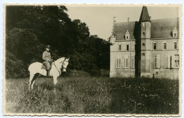 Rittmeister Freiherr von Zu Rhein verblijft in 1915 met het I. Landwehr Eskadron I. Bayerisches Armee Korps in Beveren-Waas. Hij is ingekwartierd in het kasteel Cortewalle. Deze foto van hem, trots gezeten op zijn schimmel voor het kasteel, is voorlopig een van de twee bekende foto’s van het kasteel Cortewalle die met zekerheid in de Eerste Wereldoorlog zijn genomen. In de achtergrond verschijnt een onbekende, intrigerende dame met hoed. Collectie Guido Hullebroeck