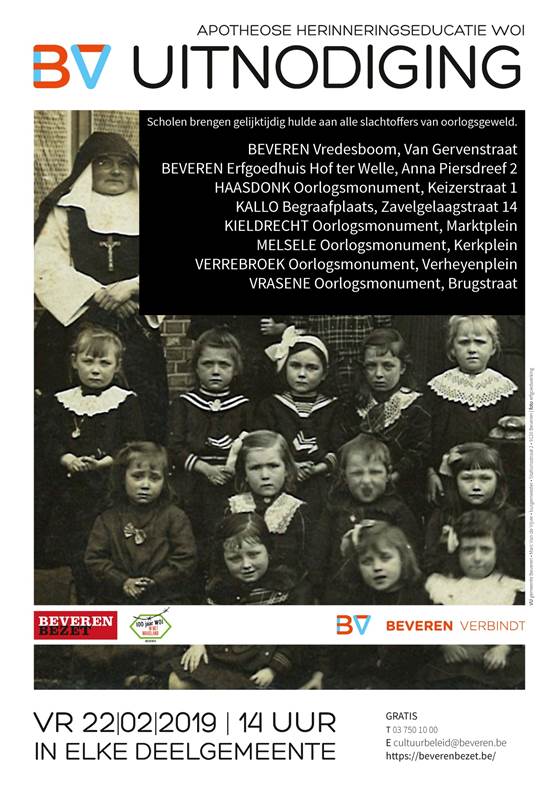 Morgen brengen 16 klassen van de 3e graad van het basisonderwijs in alle deelgemeenten van Beveren hulde aan alle slachtoffers van oorlogsgeweld in de Eerste Wereldoorlog.