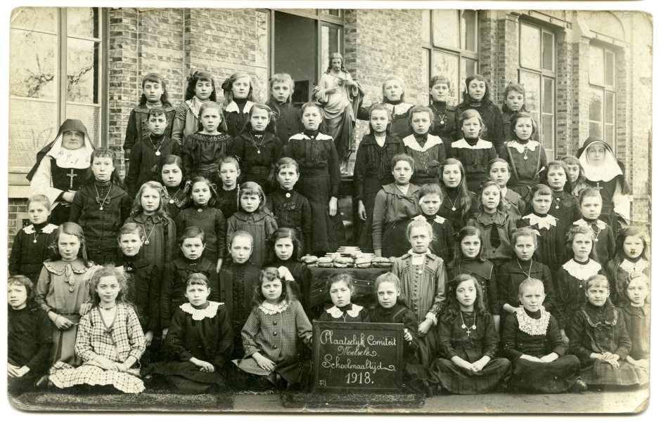 Schoolmaaltijd op de meisjesschool van de zusters van Liefde in Melsele. De broodjes liggen uitgestald op een tafeltje. Tijdens de oorlog worden in de scholen voedzame maaltijden verzorgd. Op deze manier worden jonge kinderen aangemoedigd om ook tijdens de harde bezettingsjaren onderricht te blijven volgen. Collectie Guido Hullebroeck.